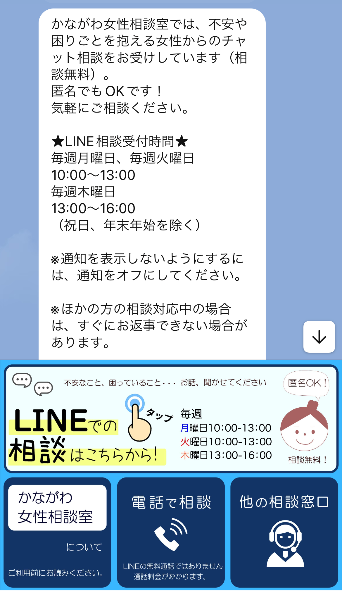 「かながわ女性相談室」は、2021年度に神奈川県の委託事業として設置されました。対面、電話、メールのほか、LINEでも相談を受け付けています。